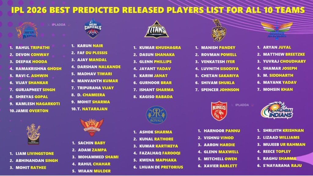 Below is an easy-reference table listing released players by franchise (major names highlighted). This is a condensed summary — scroll down for team-by-team analysis and auction outlook.
